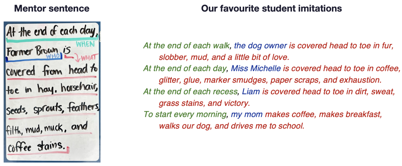 Choose a mentor sentence from a read-aloud or text students have recently read or heard. Break the sentence into chunks that make sense for your learners. We often use the language of WHO, WHAT (or DO), WHEN, WHERE (we draw inspiration from The Writing Revolution & The Syntax Project).