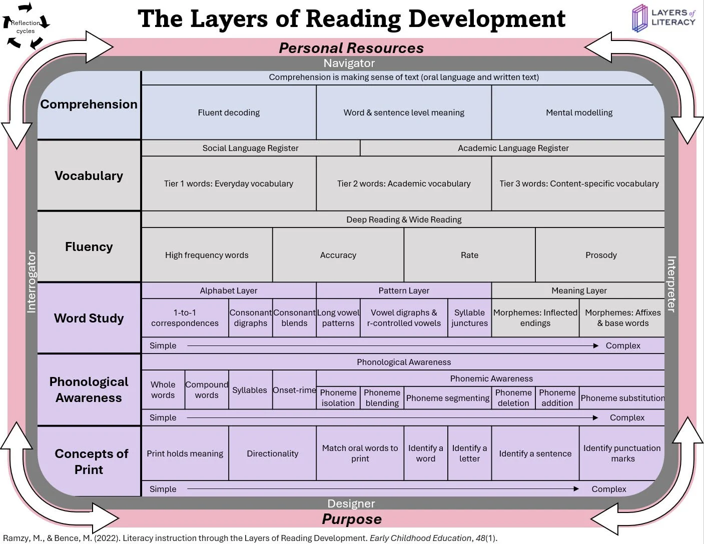 The Layers of Reading Development graphic synthesizes current research, illustrating the skills and understandings that readers draw upon when engaging with texts. The layers are not hierarchical; they operate together, wiring and firing in unison.
